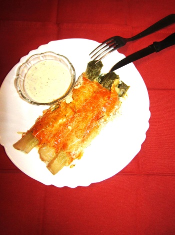 Roulez chaque poireau dans une tranche de mimolette, fixez à l’aide d’un cure-dent et déposez-les sur la crème dans le plat de cuisson ; saupoudrez de râpé.